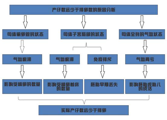 若子宮氣血瘀滯,如子宮炎,使精子在5個小時內(nèi)(有資料顯示,精子在子宮內(nèi)存活不會超過5個小時,如果5個小時之內(nèi)未離開子宮,精子將不再存活)到達(dá)受精部位的數(shù)量減少,致受精卵減少,產(chǎn)仔數(shù)降低。若卵子與精子能夠成功結(jié)合,但受精卵還要在子宮內(nèi)著床,此時子宮氣血瘀滯的狀態(tài)影響受精卵返回子宮后的著床,受精卵著床數(shù)減少,產(chǎn)仔數(shù)降低。此時需補(bǔ)氣活血,消腫安胎。