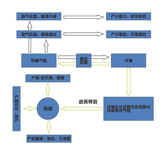 母豬分娩后,若氣血旺盛、順暢調(diào)達(dá),乳汁分泌便足,仔豬吃得飽、長得快。但實踐當(dāng)中并不如此。母豬的氣血與仔豬是相互影響的,如果母豬自身氣血旺盛,順暢調(diào)達(dá),則產(chǎn)仔數(shù)多,仔豬健壯。如果母豬氣血虧虛,甚至瘀滯不通,則產(chǎn)仔數(shù)少,仔豬成活率低。但仔豬在母豬懷孕和斷奶之前必然要與母體爭奪氣血,進(jìn)而導(dǎo)致母體氣血不足的加重。